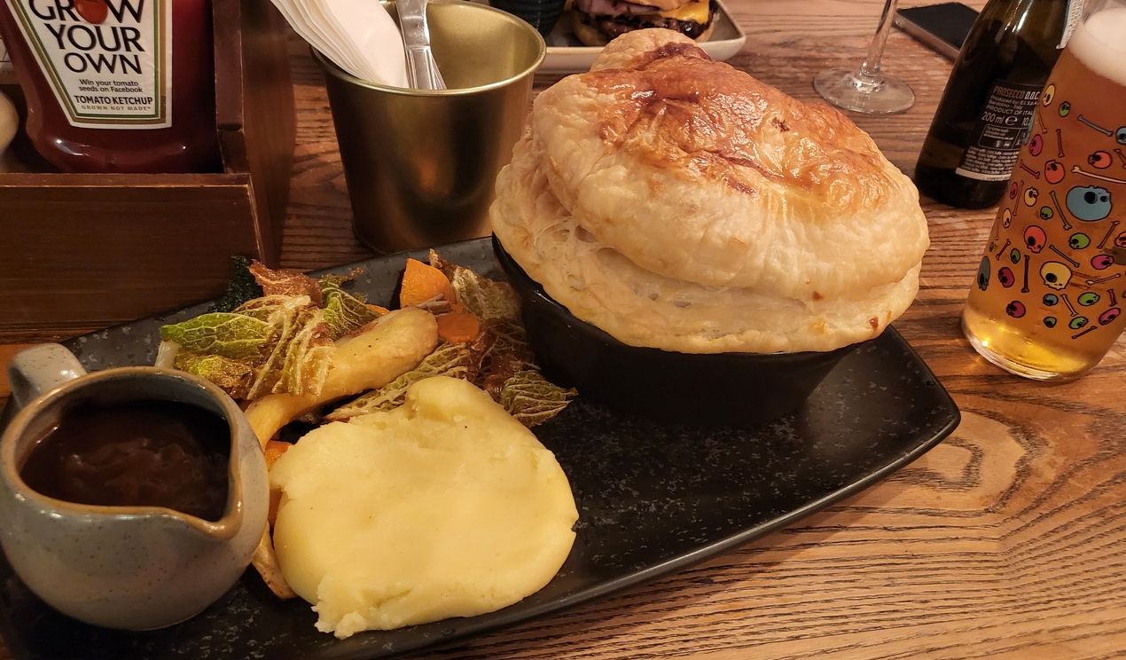 Very few plates I struggle with, however, this took some effort. Thankfully I was graced with a helping of seasoned mash, thick gravy and some delicious crisped roasted veggies to keep me distracted whilst I tackled the behemoth. You can tell by my Neck Oil above that this is over one pint worth of pie. Astonishing.