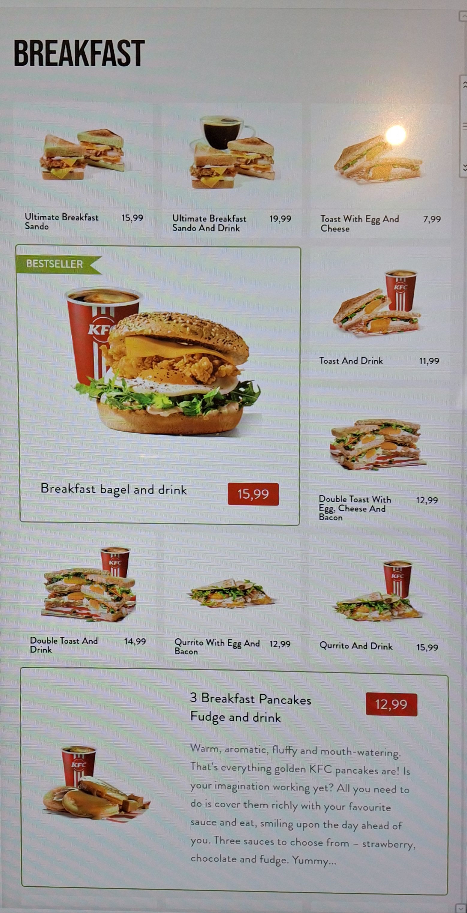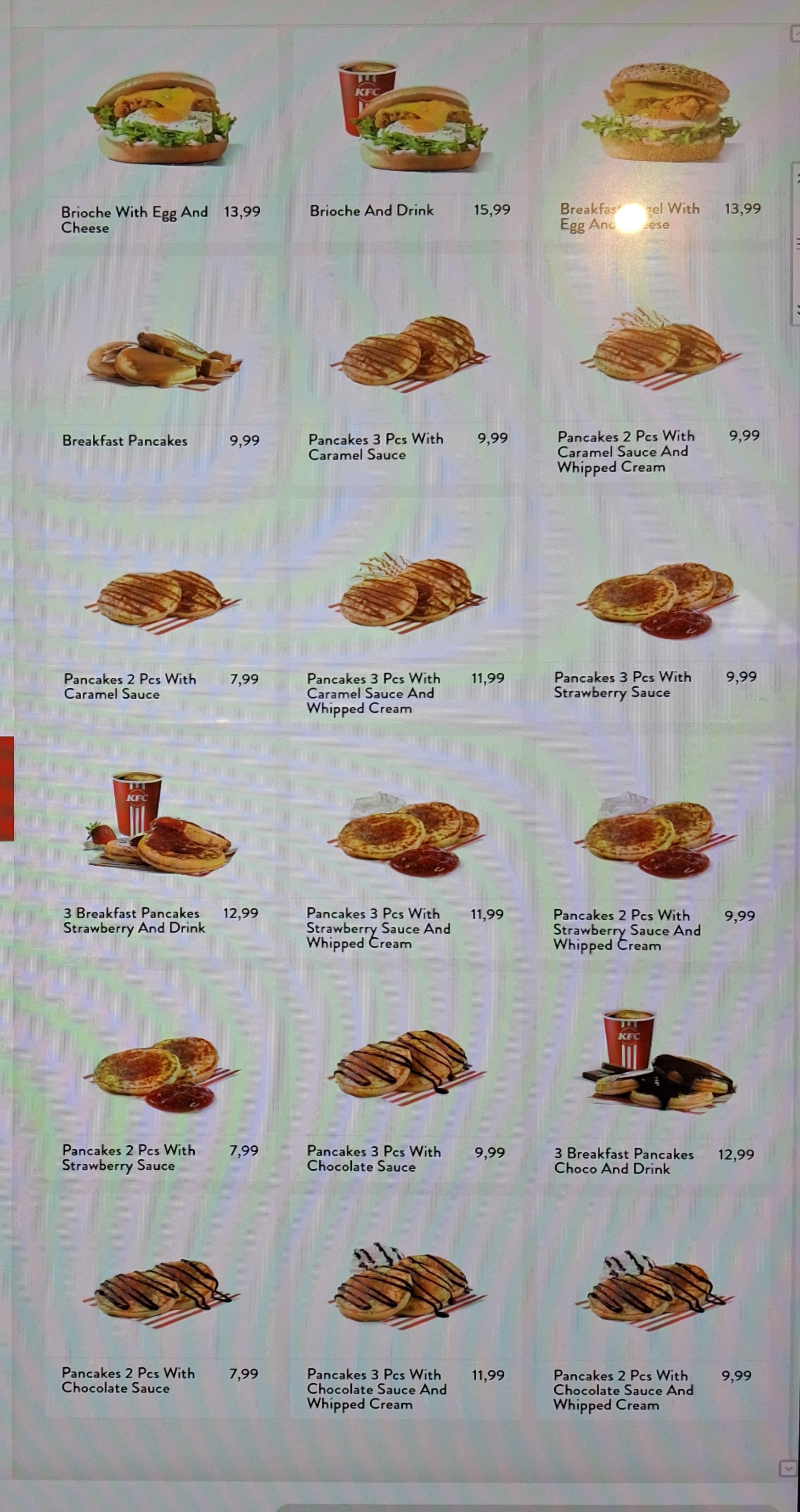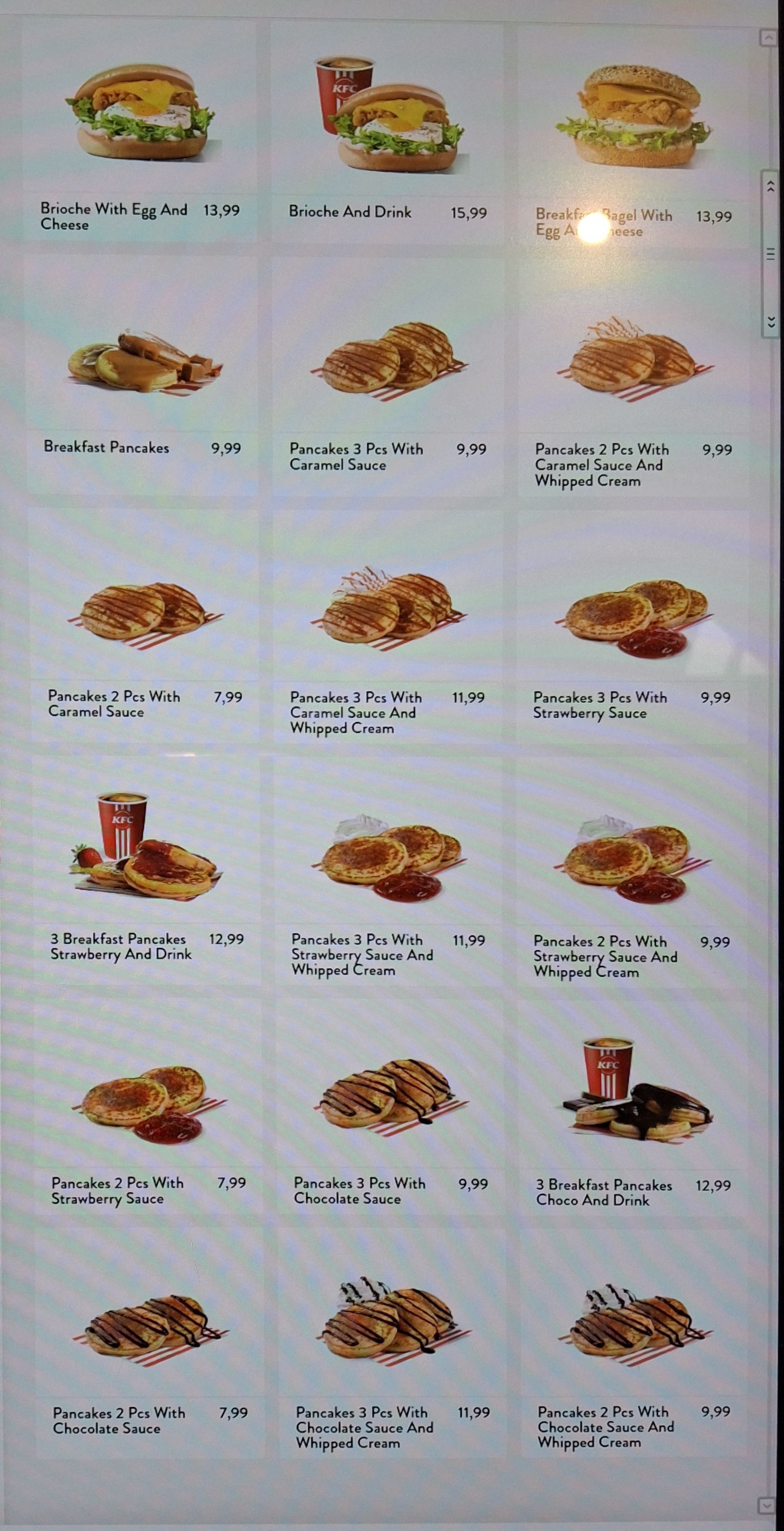 KFC breakfast in Poland is genuinely impressive. You can get pancakes for just a couple of pounds or a few dollars, while standard options like coffee, bagels, or a breakfast burger typically come in under $5.