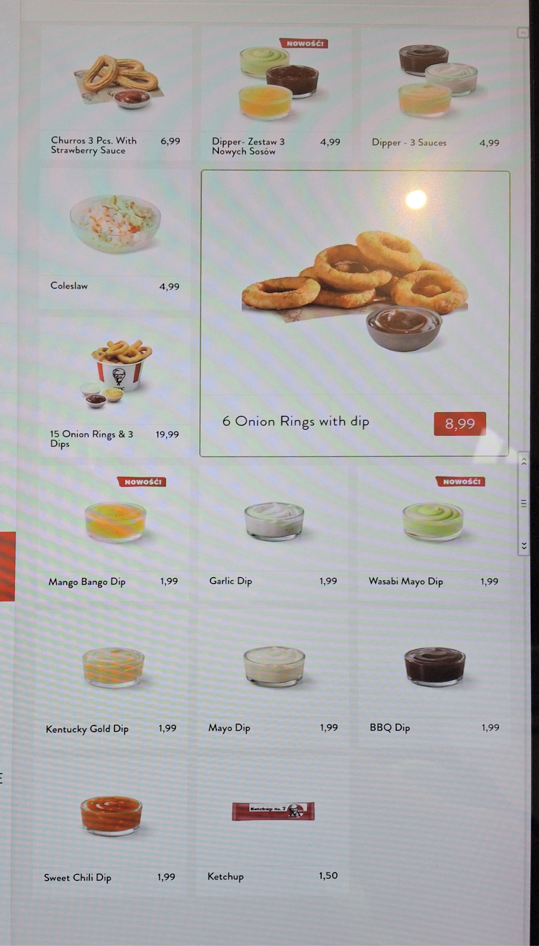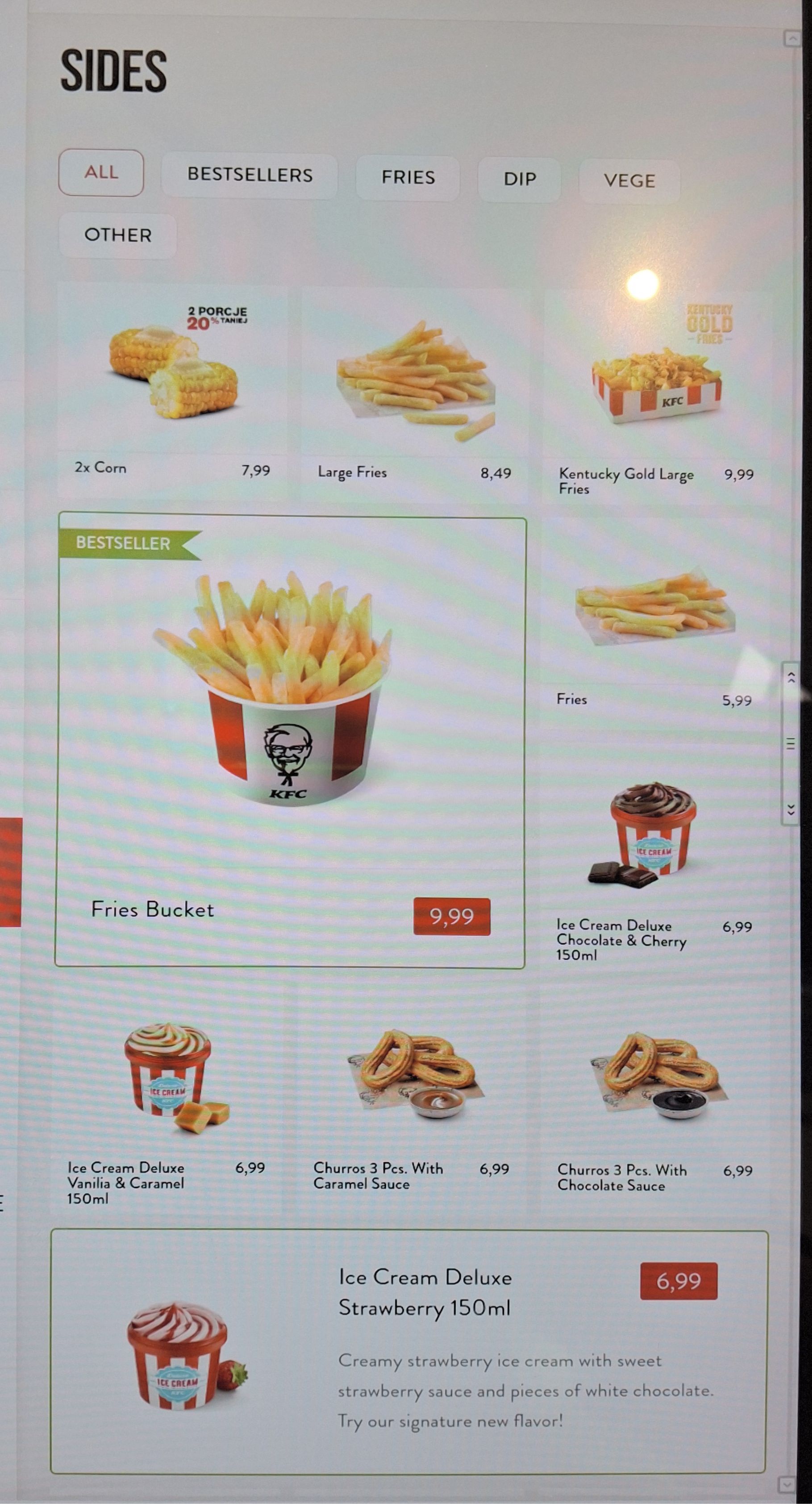 The sides menu at KFC in Poland includes most of the usual options, but there are some notable omissions. For example, mashed potatoes with gravy - common in many Western markets - are not typically available here.