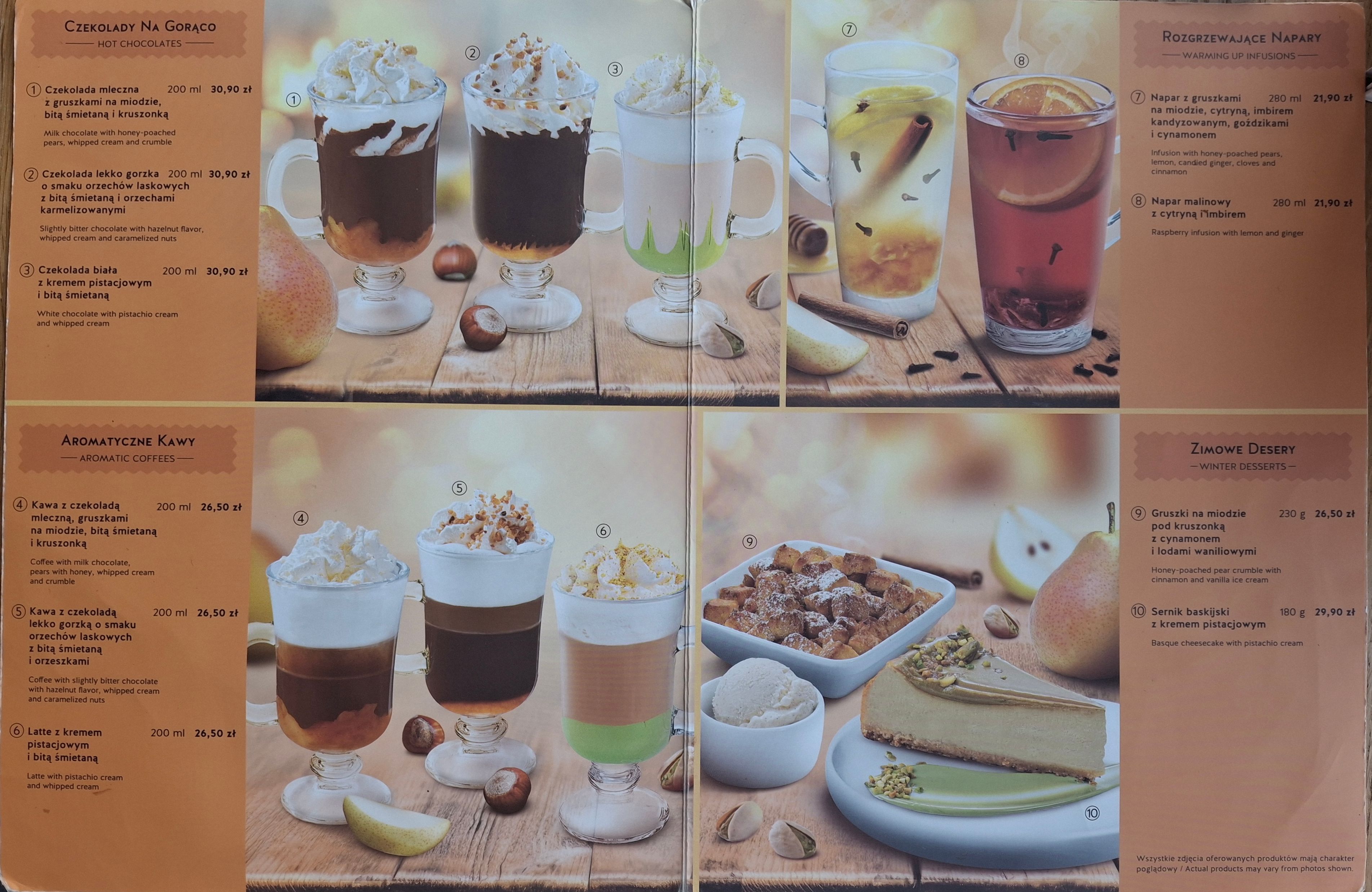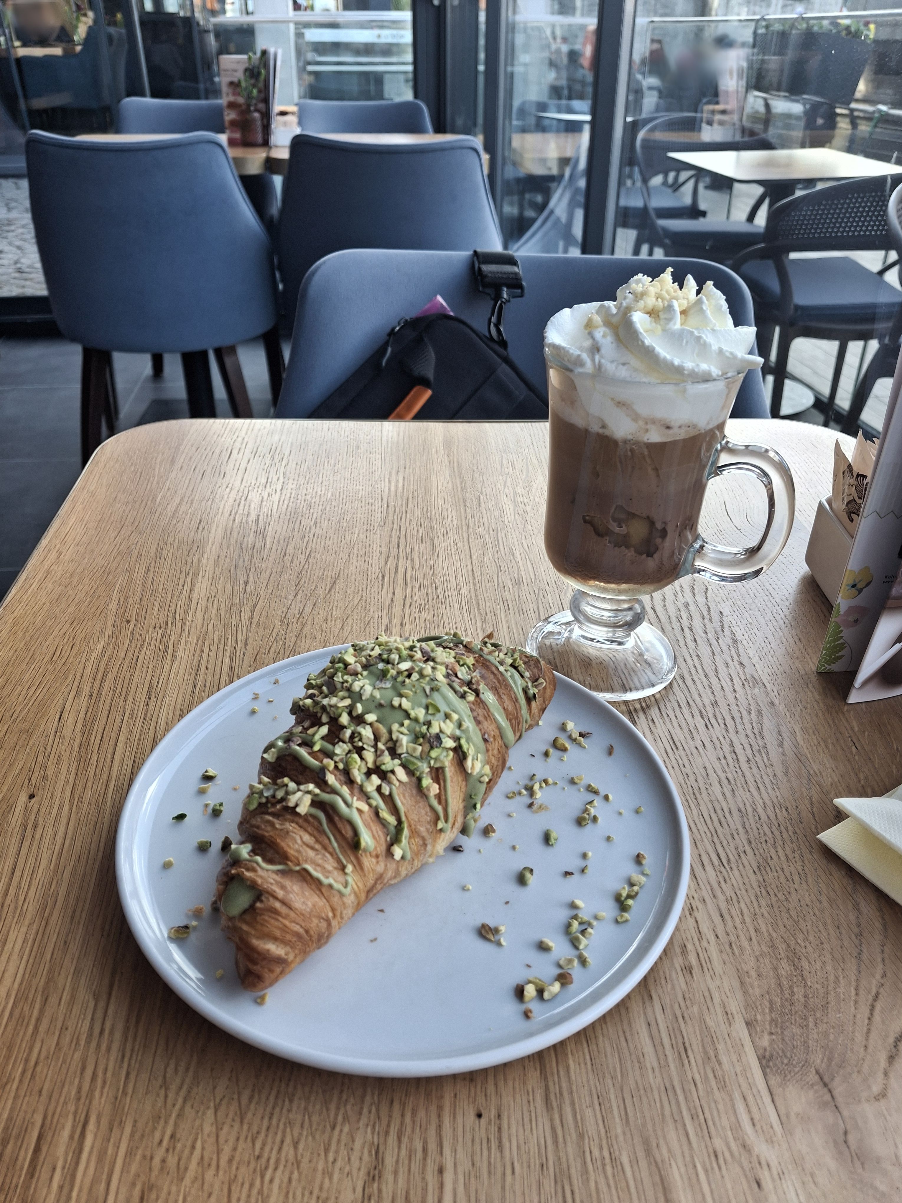 The menu is extensive, with a wide range of drinks and snacks. The offering leans toward coffee, chocolate-based drinks, cakes and bakery items. During our visit, we had a pear-infused coffee and a pistachio cream croissant. The croissant stood out for the freshness of the filling, which seemed to be added just before serving, with an additional drizzle on top.