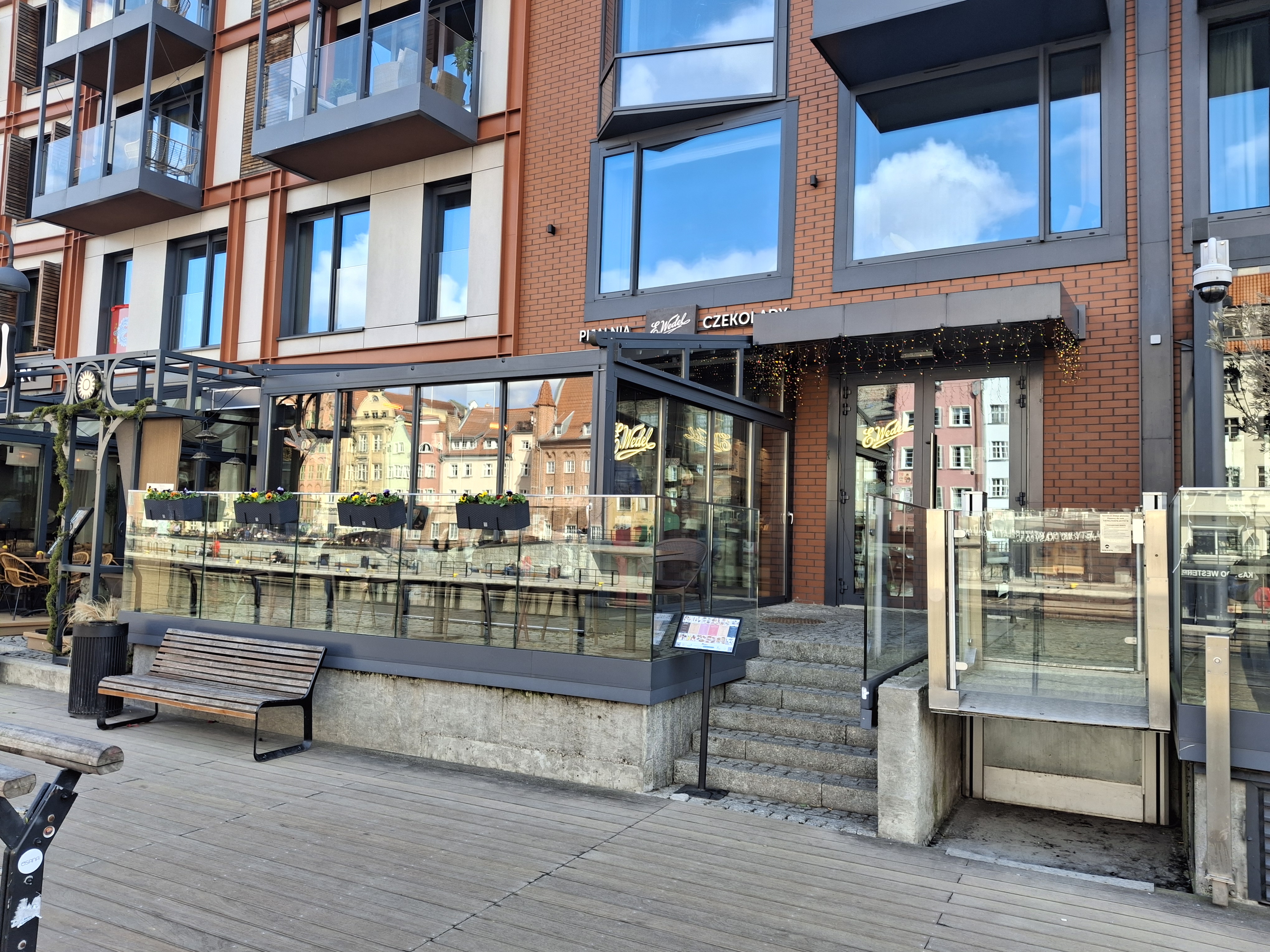 This branch is an official E. Wedel shop located on the banks of the Motława River, with views across the Old Town and the pedestrian promenade. The setting is central and easy to reach, while remaining slightly removed from the busiest areas.